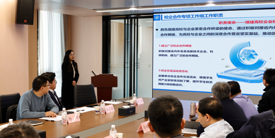 方敏汇报了校企合作组的工作职责和未来计划。她提出,将搭建高校与企业紧密合作的桥梁,构建广泛的合作网络,组织联合科研攻关,促进校企深度协同。同时,工作组将始终坚持产学研深度融合,在共建“陕西未来技术产学研平台”、共办“三秦未来技术创新创业项目路演”、共筹“陕西未来技术产学研发展基金”、共促“校企双向奔赴”系列品牌活动等四个方面持续发力,推动新质生产力发展,培育未来科技创新领军人才。